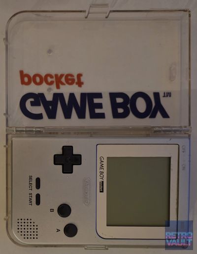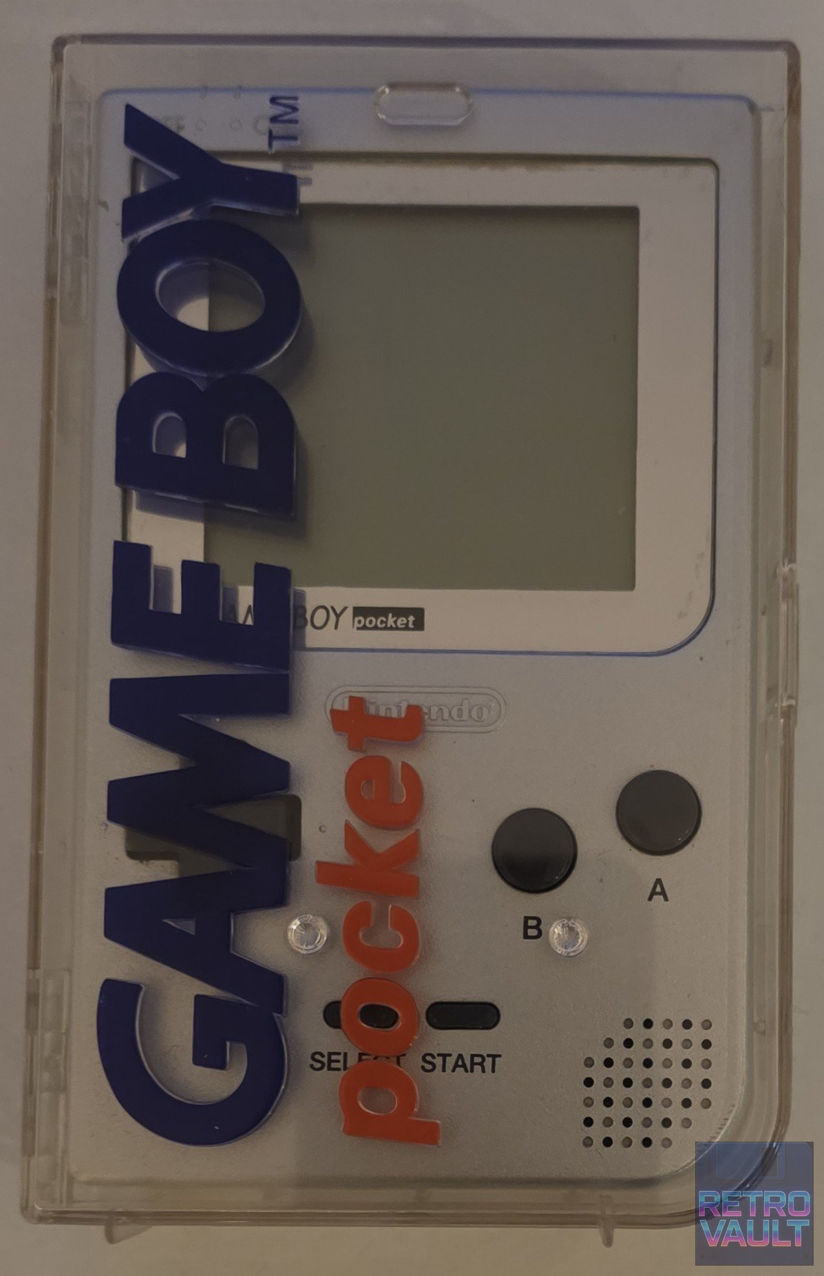 Lancé en 1996, le Game Boy Pocket est la première révision majeure du Game Boy original par Nintendo. Conçu par l'équipe de Gunpei Yokoi, il réduit le volume de 30% et le poids de moitié tout en conservant une compatibilité totale avec la bibliothèque Game Boy existante. Le redesign apporte un écran LCD amélioré sans la teinte verdâtre du DMG-01, avec un meilleur contraste et une rémanence réduite — un reproche récurrent sur l'original. L'alimentation passe de 4 piles AA à 2 piles AAA pour environ 10h d'autonomie. La boîte transparente rigide fournie avec chaque unité est emblématique du GBP : elle sert aussi de rangement pour une cartouche. Cet exemplaire version Europe est distribué via Grundig AG en Allemagne (mention "Trademark used according to agreement with Grundig AG" visible sur l'emballage). Le coloris Silver est le coloris de lancement et le plus iconique.