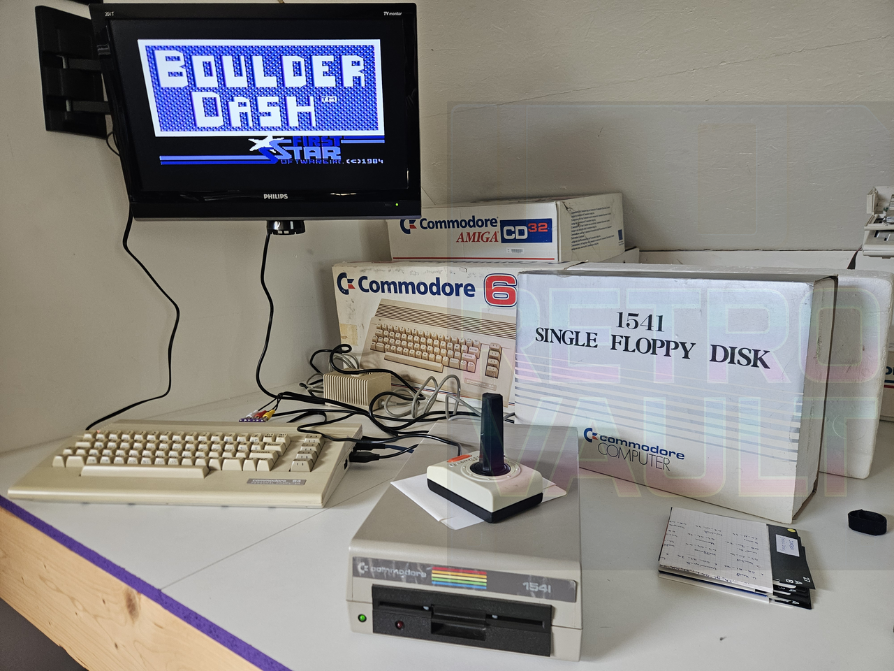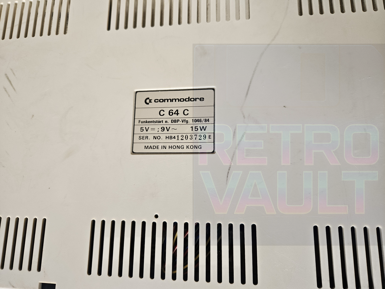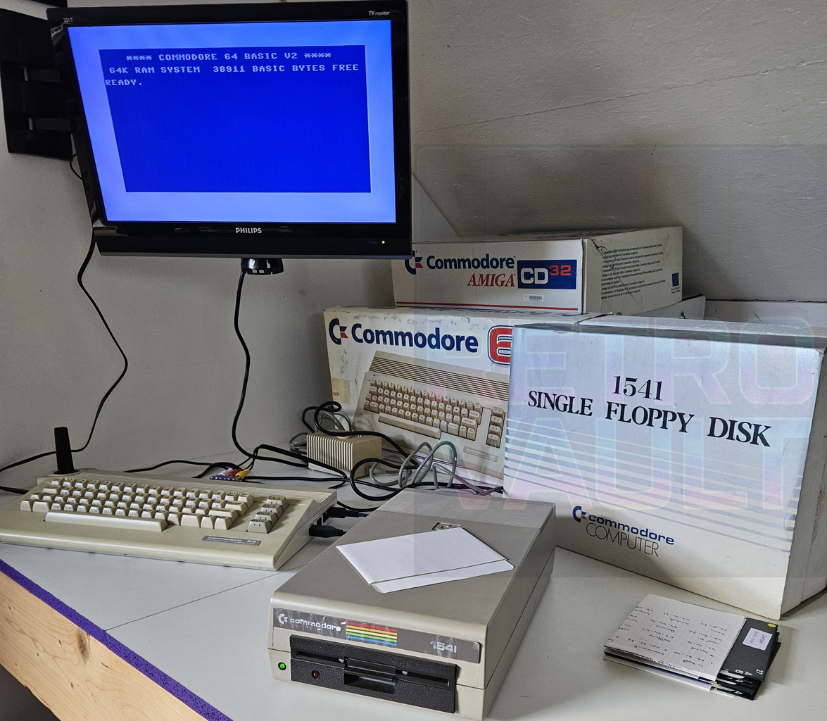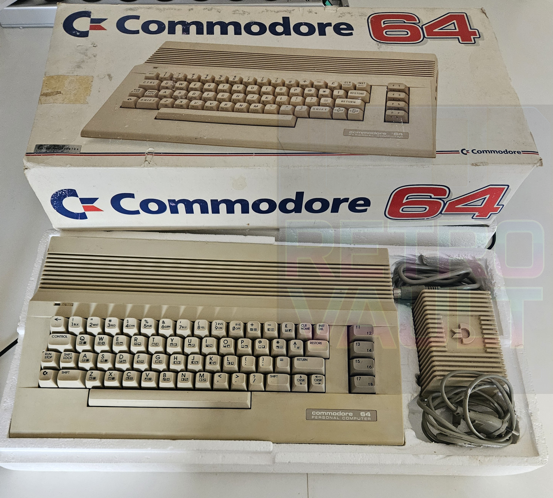 Description: 🕹️ Commodore 64C — Version boîtier plat produite à Hong Kong à partir de 1986, avec sa boîte d’origine, sans les manuels.