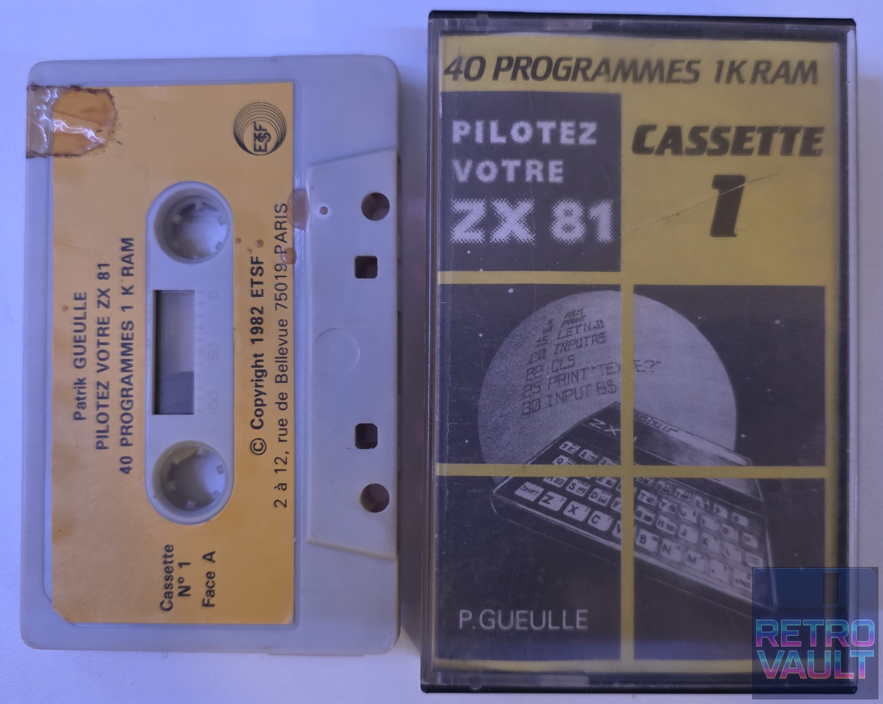 Cassette d'accompagnement du livre "Pilotez votre ZX 81" de Patrick Gueulle, publié par les éditions ETSF/Micro-Systèmes, rue de Bellevue, Paris, en 1982. L'ouvrage propose une découverte progressive du ZX-81 à travers 40 programmes originaux en BASIC 1K, conçus pour être utilisables sans connaissances préalables en programmation. Fait partie de la vague de publications francophones qui accompagnait la démocratisation de l'informatique personnelle en France au début des années 80. L'édition française de programmes ZX81 est nettement plus rare que son équivalent britannique sur le marché du collectionnisme.