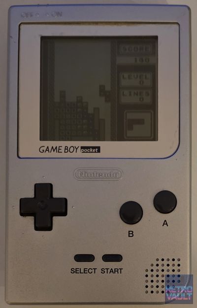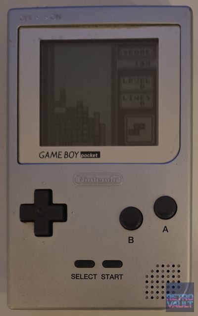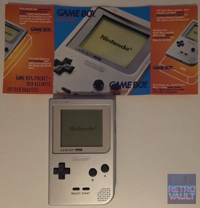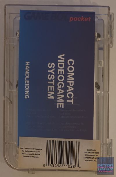 Lancé en 1996, le Game Boy Pocket est la première révision majeure du Game Boy original par Nintendo. Conçu par l'équipe de Gunpei Yokoi, il réduit le volume de 30% et le poids de moitié tout en conservant une compatibilité totale avec la bibliothèque Game Boy existante. Le redesign apporte un écran LCD amélioré sans la teinte verdâtre du DMG-01, avec un meilleur contraste et une rémanence réduite — un reproche récurrent sur l'original. L'alimentation passe de 4 piles AA à 2 piles AAA pour environ 10h d'autonomie. La boîte transparente rigide fournie avec chaque unité est emblématique du GBP : elle sert aussi de rangement pour une cartouche. Cet exemplaire version Europe est distribué via Grundig AG en Allemagne (mention "Trademark used according to agreement with Grundig AG" visible sur l'emballage). Le coloris Silver est le coloris de lancement et le plus iconique.