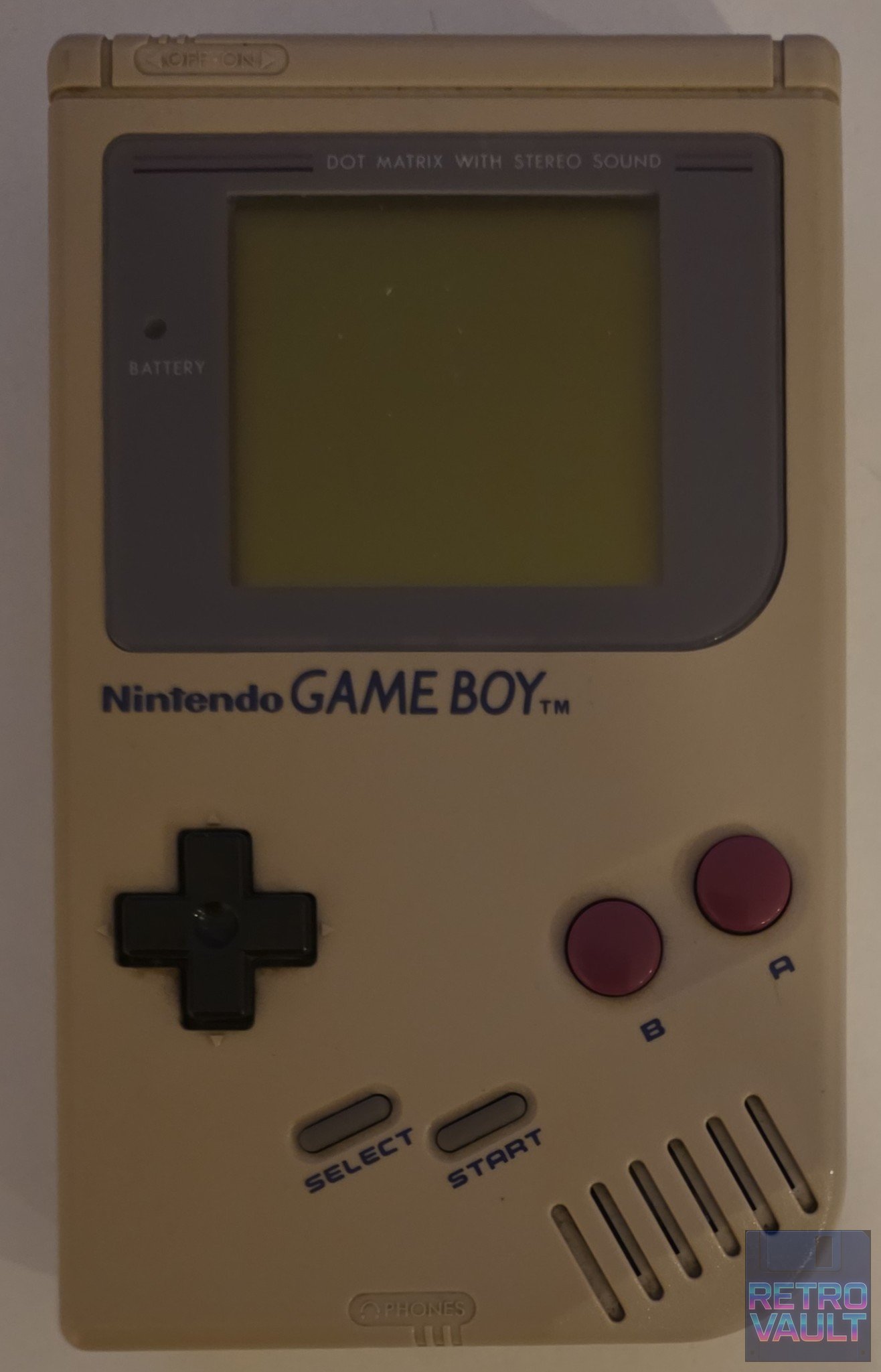 Le Game Boy DMG-01 (DMG = Dot Matrix Game) est la console portable originale de Nintendo, lancée en avril 1989 au Japon par Gunpei Yokoi. Conçu autour d'un processeur Sharp LR35902 à 4,19 MHz et d'un écran LCD monochrome réflectif 160×144 pixels, le DMG-01 a été délibérément conçu pour la robustesse et l'autonomie (30h sur 4 piles AA) plutôt que pour la performance — un choix stratégique face à l'Atari Lynx et la Sega Game Gear, plus puissants mais bien plus gourmands. Bundlé avec Tetris en occident, il s'est vendu à plus de 118 millions d'unités toutes révisions confondues (Game Boy + Game Boy Pocket + Game Boy Color). Cet exemplaire est fabriqué au Japon ("Made in Japan"), ce qui correspond aux premières séries de production — les modèles tardifs étant produits en Chine. Le numéro G19973670 permet de le dater approximativement de la période 1991-1992.